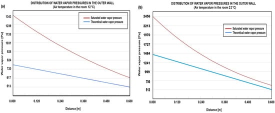 Water vapor pressure distribution across the exterior wall section from outside to inside, under two indoor temperature scenarios: (a) 12 °C and (b) 22 °C. The outdoor air temperature is fixed at 0 °C.