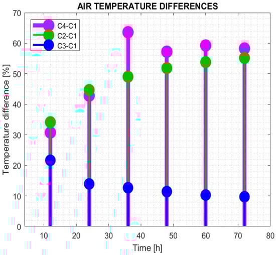 The analysis of air temperature at the center of the room demonstrates that different heating approaches lead to varying thermal stability. The absence of underfloor heating in case C1 results in a relatively low temperature increase over the monitored period of 72 h. The air temperature differences in C2, C3, and C4, relative to the unheated room C1, were calculated for selected heating times and are displayed in Figure 10.