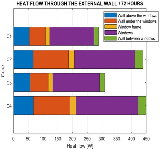 The study also investigated heat loss through the external wall, revealing a correlation with the air temperature differences between the interior and exterior of the room. Figure 11 compares heat flow through various segments of the external wall for cases C1, C2, C3, and C4 at the 72 h mark. The windows and the wall section below them were identified as the most significant areas of heat loss. The proportion of heat loss through the windows relative to the total heat loss through the external wall was approximately 51% in case C3 and 52% in case C1. In cases C2 and C4, this proportion was around 47%. Heat loss through the wall below the windows accounted for approximately 28% in case C4, 27% in case C2, 20% in case C3, and 19% in case C1. Based on these findings, recommended modifications to the existing building include mainly the application of appropriate thermal insulation to the perimeter walls and replacing existing windows with models featuring lower thermal transmittance.