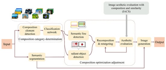 - A framework of image aesthetic evaluation with composition and similarity-based optimization (FIACSO) was proposed. This framework categorized the composition of the image initially and then utilized a semantic segmentation network to segment the image, extracting composition information. Subsequently, the IACS method was applied to optimize adjustments to the image. Finally, a generative adversarial network (GAN) was employed to generate optimized images that adhered to composition rules and closely resembled the original image.
