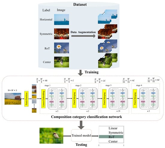 - Composition category determination: In this section, a composition category determination network was designed to detect the composition category of the input image. This network was capable of flexibly identifying complex composition characteristics during the composition category prediction phase and provided confidence scores for adherence to composition rules, thereby demonstrating high accuracy and generalization capabilities.