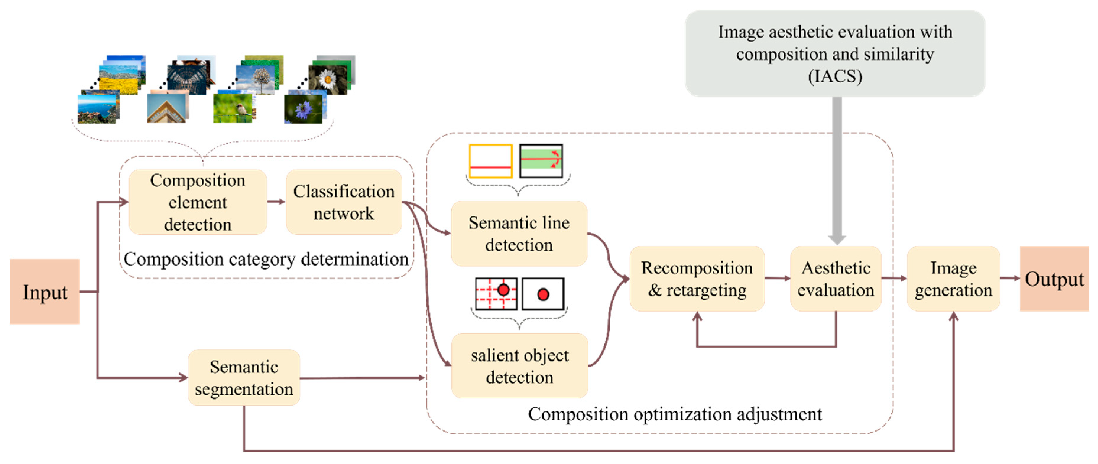 The original image is initially categorized into composition category , followed by semantic segmentation to obtain the segmented result image containing composition information. Subsequently, the image composition is incrementally adjusted using the IACS method, resulting in the adjusted image . Finally, a generative adversarial network combines the original image with the adjusted image to generate the image, producing the optimized result image . This process enhances the composition aesthetics while preserving the content and features of the original image.