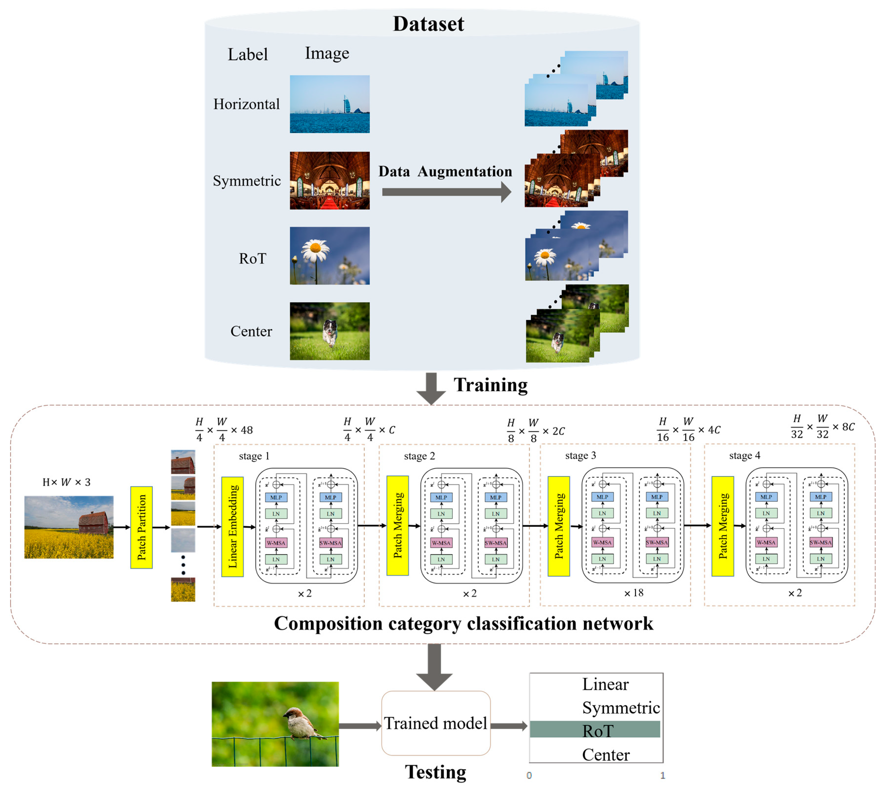 Composition category determination: In this section, a composition category determination network was designed to detect the composition category of the input image. This network was capable of flexibly identifying complex composition characteristics during the composition category prediction phase and provided confidence scores for adherence to composition rules, thereby demonstrating high accuracy and generalization capabilities.
