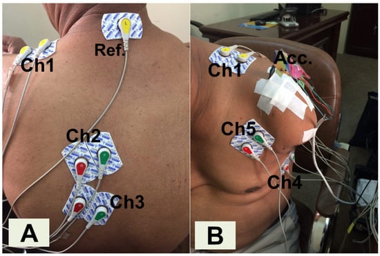 The experimental setup for recording EMG and ACC data in a transhumeral amputee. (A) shows the back of the patient, where Channel 1 (Ch1) and Ch3 recorded the myoelectric activity of the upper and lower fibers of the trapezius, whereas Ch2 was placed on the rhomboid major. The reference (Ref.) electrode was placed on the neck. (B) shows the front of the participant, the ACC sensor was placed on the shoulder, while Ch4 and Ch5 were placed on the serratus anterior and the pectoralis minor, respectively.