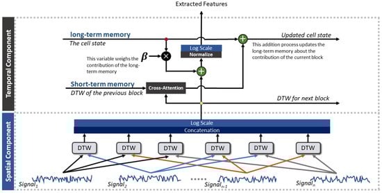 The spatiotemporal warping feature extraction is pursued through the temporal information fusion, as highlighted in Figure 2. Here, the feature vector extracted from the current set of windows at time t, denoted as , is added to a scaled version (scaling factor ) of the cell state component . The architecture exploits the concept of the cell state to account for long-term memory information [28,29]. This process can be understood as an information highway that traverses through all cells across multiple time steps, leading to a recursive representation of the features. A parameter is employed to control the cell information update, as follows: