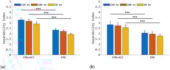 The results presented in Section 3.1 highlight that EMG+ACC guarantees significantly higher SIs compared with the EMG condition for both the IL and AMP groups (see Figure 3a,b). Moreover, the better separability properties of EMG+ACC held for all three WLs analyzed, meaning that the introduction of ACC information has a positive impact for WLs lower than 150 ms. This outlines that the proposed methodology has the potential to be applied in practical contexts, where short WLs are beneficial for developing real-time prosthetic control. In passing, many recent studies still computed features over temporal epochs equal to or even larger than 150 ms [2,19,36], indicating that dealing with short WLs (<100 ms) for feature extraction represents an issue that is far from being fully addressed [2,19,36]. It should be noted that the IL and AMP groups share a similar range of SI values, consistent with respect to the EMG+ACC and EMG conditions, indicating that A-STW produced separable clusters also when applied to impaired participants. A possible drawback is that the boost observed in class separability is obtained at the cost of enlarging the dimension of the feature spaces. Indeed, the dimension given by EMG+ACC was 84, whereas it was 30 for EMG only. However, the complexity induced by the introduction of ACC data can be handled by the modern microcontrollers for real-time applications, eventually mitigating the increase in computational burden carried by the A-STW sensor fusion approach.