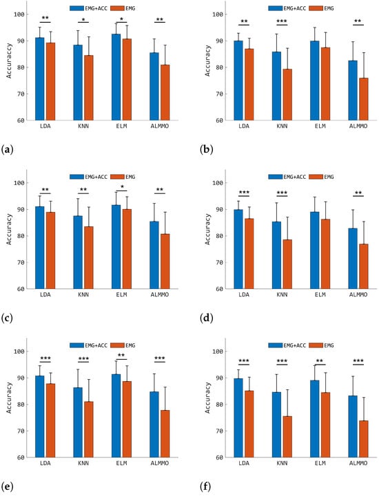 (a,c,e) show the mean accuracies in the IL group for WLs of 150, 100, and 50 ms, respectively. The blue bars refer to EMG+ACC conditions, while the red bars indicate the case of using only EMG data. In the same way, (b,d,f) show the mean accuracy for the AMP group in the same order of WLs and with the same representative colors. The symbols *, **, and *** indicate p < 0.05, p < 0.01, and p < 0.001, respectively.
