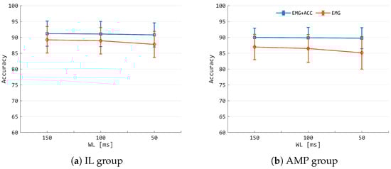 The analysis of the effects of decreasing WL is reported in Figure 5. It can be observed that, for both the IL and AMP groups, the EMG-only condition exhibited detrimental effects on classification performance, with a reduction in the mean accuracy and a higher variance across participants. Conversely, the EMG+ACC condition maintained stable performance, showing no consistent increase in variance and no noticeable drop in accuracy for either group.