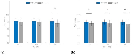 Results comparing LDA accuracy using A-STW with EMG+ACC and multimodal feature fusion (Merged) with WLs of 150, 100, and 50 ms for both the IL (a) and AMP (b) groups. The symbol * indicates 0.05, and ** indicates 0.01.