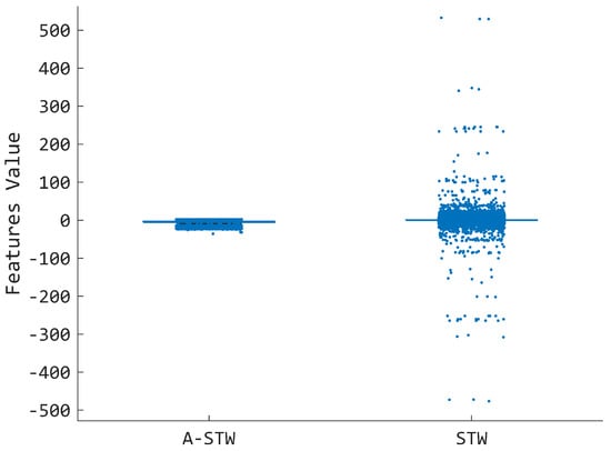 Jitter plot of the representative first component of the feature set generated for a participant with amputation when A-STW and STW were applied. Example reported for a WL of 150 ms.