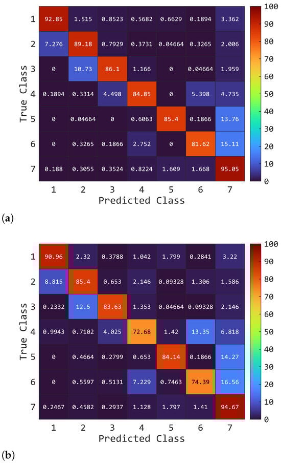 This figure shows the mean confusion charts among participants with amputation obtained during testing using LDA with features computed at 150 ms. (a) shows the case of using EMG+ACC, whereas in (b), the case of EMG only is reported. Classes represent the following: (1) elevation, (2) depression, (3) protraction, (4) retraction, (5–6) upward and downward rotation, and (7) rest.