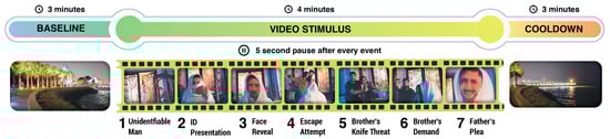 Experiment flow. The experiment comprised three videos: 3 min baseline, 4 min video stimulus, and 3 min cooldown. The entire video stimulus is a continuously shot scene that depicts a possible real-life scenario that could occur in the field. At seven different events during the experiment, a 5 s pause was employed wherein the participants were shown a prompt asking them to decide on the best course of action. Each event represents a unique scenario.
