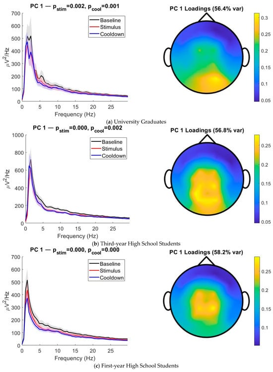 Average activity of different frequency bands. Spectral power and spatial topography of the first principal component (PC1) across cohorts. For each group—(a) university students, (b) third-year high school students, and (c) first-year high school students—the left panel shows the power spectral density (PSD) of PC1 during baseline (black), stimulus (red), and cooldown (blue) periods. Shaded regions indicate the standard error of the mean. Statistical significance of broadband power suppression during the stimulus and cooldown periods was assessed using paired t-tests relative to baseline, with resulting p-values reported above each plot. The right panel shows the scalp topography of the PC1 spatial loadings, with the percentage of variance explained indicated in the title. Across all cohorts, PC1 exhibited significant broadband suppression during the stimulus and/or cooldown periods and reflected a spatially global mode of neural activity, with peak contributions centered over midline and central scalp regions.