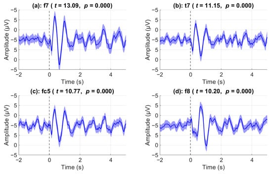 Event-related potentials in top four significant channels. Grand-average event-related potentials (ERPs) at the four channels showing the strongest post-stimulus responses. Channels were selected based on the largest effect sizes from a two-tailed paired t-test comparing post-stimulus (0–5 s) to pre-stimulus (–2 to 0 s) activity across all trials and participants. The plots display mean voltage (black trace) ± standard error (blue shading). All four channels (F7, T7, FC5, F8) showed statistically significant ERP responses (p < 0.001), with peak amplitudes occurring within the first second after stimulus onset.