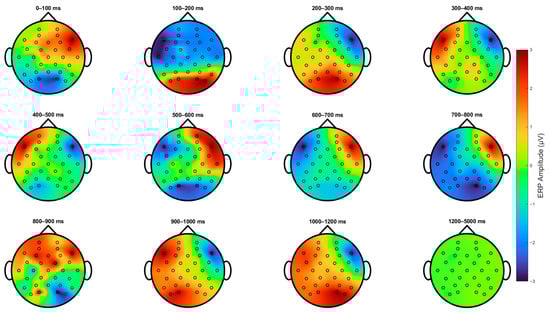 Figure 4 shows the topological projections across the scalps of the participants from stimulus onset for up to 5 s. Primarily, three main regions were activated: the parietal-occipital lobe and the left and right frontal-temporal areas, which were mainly indexed by channels F7 and F8. First, 100–200 ms after stimulus onset, we can observe an increase in the activation of parietal-occipital channels and a decrease in the frontal region. Secondly, from 200 to 800 ms, we can observe the same phenomenon as that in Figure 3. Then, there is a positive deflection on the left and a negative deflection on the right, and then the polarity switches near the 600 ms mark. Subsequently, the polarity of the left and right frontal areas switches again at the 900 ms mark, and an additional increase in activity in the parietal-occipital area is evident. Finally, the ERP returns to baseline after 1200 ms.