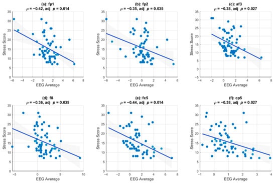 As described in the Section 2, we investigated whether the frequency components of these ERPs could be correlated with stress. We applied a channel-wise Pearson correlation between the average post-stimulus activity of the four canonical frequency bands and overall stress scores. Only post-stimulus delta-band activity exhibits channel-wise correlations with stress scores. Figure 5 shows the channels that survived multiple comparison testing and that exhibited a statistically significant linear correlation between stress scores and the instantaneous amplitudes of the delta-band activity. Pearson correlation analysis revealed significant negative associations, indicating that increased EEG amplitude was consistently associated with lower perceived stress. Specifically, six channels (FP1, FP2, AF3, F8, FC5, and CP5) demonstrated significant negative correlations that survived multiple comparison correction (FDR-adjusted p < 0.05).