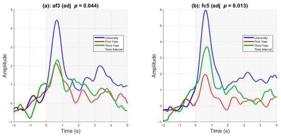 Delta-band activity as a function of cohort rank. Delta-band activity over time for channels AF3 and FC5, shown separately for university (blue), third-year high school (green), and first-year high school (red) cohorts. Delta-band activity was estimated by extracting the analytic amplitude from the Hilbert transform of delta-filtered (1–4 Hz) ERP signals, followed by smoothing with a moving-average filter. These exemplar channels were selected based on statistically significant differences in post-stimulus delta activity across cohorts (adjusted p < 0.05), using a one-way ANOVA followed by post hoc testing. Both channels exhibit a clear increase in delta activity following stimulus onset, with group-level differences emerging near the 1 s mark. In both AF3 and FC5, university students show the largest delta response, while first-year students show the weakest, reflecting a graded pattern of activation aligned with cohort rank. This pattern remains especially elevated in the university group beyond 3 s post-stimulus.