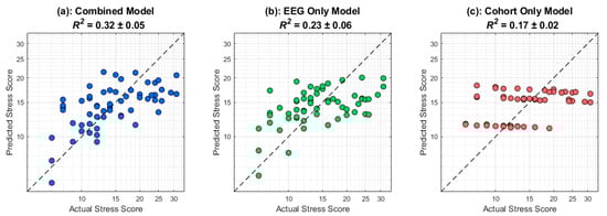 Figure 7 displays the results of the cross-validated stress prediction framework as described in the Section 2. The dashed black line corresponds to perfect prediction. Firstly, there is information contained in the cohort that relates to perceived stress scores since different training amounts would lead to group-level differences in stress response (R2 = 0.17). The EEG only, which excludes cohort identity, yields a higher predictive performance (R2 = 0.23). However, when including both cohort rank and post-stimulus delta EEG activity, a combined model is able to perform much better than a cohort only model, with a ∆R2 = 0.15, highlighting the utility of EEG in predicting stress responses in a timescale that is in the order of seconds. The ∆R2 was not sensitive to initial randomization in the cross-validation scheme, as 19 out of 20 iterations showed significant performance of the combined model compared to the cohort-only model (Figure S1). The MAE histogram and residuals of the combined model are also demonstrated in Figure S1. To confirm that our cross-validation approach is not sensitive to the chosen time window of 2 to 5 s post-stimulus onset, a hyperparameter search was conducted where the start time and end time of the time window were adjusted in 0.5 s increments. The performance of the classifier did not significantly change as a function of the time window, as long as it is chosen to capture temporal dynamics occurring in the later stages of the stimulus. The highest-performing time window was from 3 to 5 s (Figure S2). We also evaluated the stability of the predictive model across a range of ridge penalties (λ = 0–1 in steps of 0.1). Model performance remained essentially unchanged across this range (∆R2 < 0.01), confirming that the predictive results are robust to the choice of λ. For consistency, subsequent analyses were conducted with λ fixed at 0.2. Finally, to evaluate whether a nonlinear model could improve prediction performance, we trained a shallow ANN with one hidden layer (8 ReLU units) and a linear regression output under the same cross-validation and feature selection methodology as above. Combined R2 performed consistently below baseline (mean R2 = −0.52).