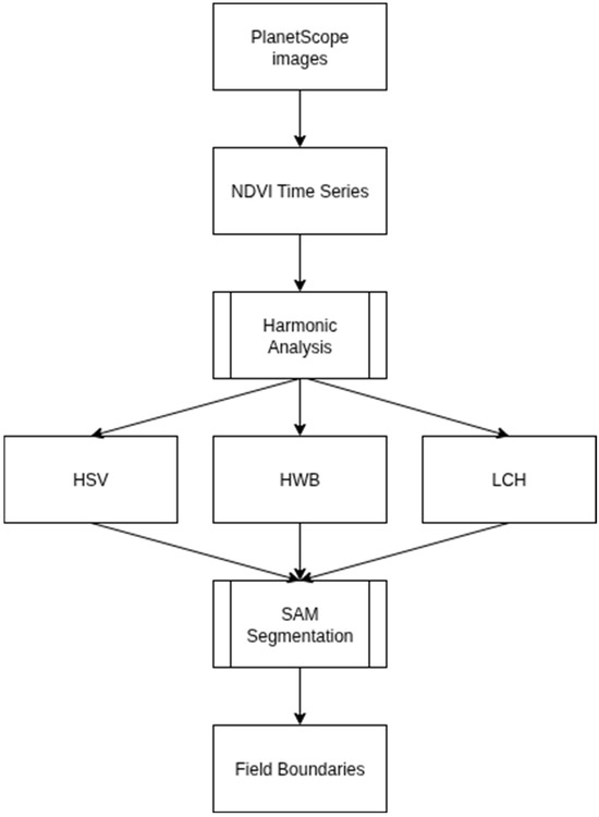 The overall workflow of the proposed method is summarized in Figure 2. Starting with PlanetScope images, NDVI time series are computed and subjected to harmonic analysis to extract the mean, amplitude, and phase. These components are then mapped into cylindrical colour spaces which generate recoloured composites optimized for boundary detection. SAM is subsequently applied to these composites, producing delineated field boundaries for evaluation.