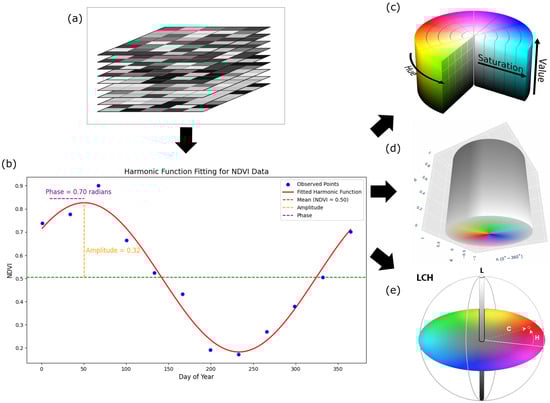 (a) Multitemporal NDVI stack; (b) harmonic fit per pixel and extraction of parameters; (c) mapping to HSV colour space; (d) mapping to HWB colour space; (e) mapping to LCH colour space.