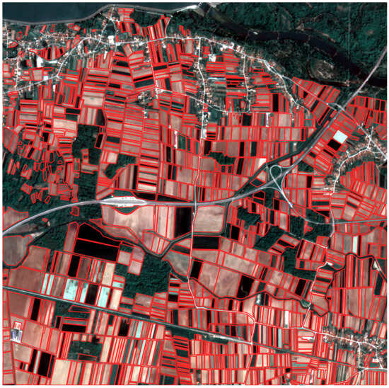 The analysis was carried out in a 5 km × 5 km area near Varaždin in northern Croatia. On the PlanetScope scenes (Figure 1), the landscape consists mainly of small agricultural parcels with few hard physical boundaries. Apart from roads and occasional drainage lines, field boundaries are usually not marked by hedges, fences, or rows of trees. Boundaries manifest themselves as subtle shifts in tone, texture, seeding direction, and phenological stages between neighbouring strips.