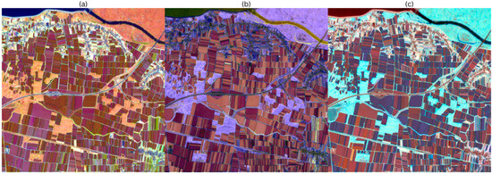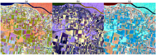 In the Luminance–Chroma–Hue colour space, the luminance represents the mean green intensity, the chroma represents the seasonal strength, and the hue angle represents the timing. As the chroma is extended to the entire area, parcels with strong seasonality are given a high colour purity, while weakly seasonal areas collapse towards grey. To avoid clipping outside the sRGB boundaries, chroma values were adaptively scaled to the maximum valid range, ensuring that hue and luminance relationships were preserved without distortion. Figure 3e illustrates the assignment of the three factors to the LCH colour space. The phase corresponds to the hue; chroma is the normalized amplitude; and the lightness is the mean NDVI. The LCH triplet is then rendered using the standard LCH–LAB–RGB conversion, in which the timing, seasonal range, and baseline greenness are encoded as separate visual channels.