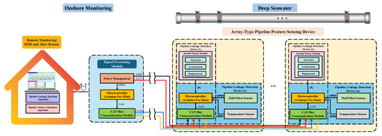 The pipeline posture sensing module integrates the microcontroller, the CAN Bus module, and the inertial sensor module. Its configuration along the pipeline is presented in Figure 3. The inertial sensor module includes a three-axis accelerometer, gyroscope, and magnetometer, which can collect the acceleration signals, angular velocity signals, and magnetic signals of the pipeline’s subsea postures, estimating the bending, buckling, and other abnormal pipeline states. All data collected by the sensing modules along the pipeline were transmitted via the CAN Bus network to the pipeline monitoring system for real-time computation and processing of the pipeline’s posture. The CAN Bus utilizes differential signaling to reduce electromagnetic interference and it features an auto-retransmission mechanism, ensuring stable and reliable remote monitoring. Furthermore, extendable coiled connections between sensors can minimize cable strain caused by posture changes, enhancing the reliability of the posture sensing module.