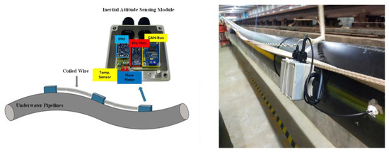 This system measured the posture variation of a subsea water intake pipeline. It comprises underwater sensing modules and the monitoring interface device, as shown in Figure 2. Signal data transmission was conducted using a Controller Area Network (CAN Bus) to ensure the real-time delivery and stability of monitoring information transmission. In underwater sensing parts, the pipeline posture sensing modules are used to monitor pipeline postures. When deviations in the pipeline posture occur, the integrated accelerometer, gyroscope, and magnetometer can provide nine different physical parameters. These can be integrated with the Extended Kalman Filter (EKF) to enhance the algorithm’s accuracy. The pipeline leakage detection module monitors leak locations and estimates the extent of the damage area. Using Hall sensors equipped with internal impellers and magnetic sensing units, the module can detect the corresponding Hall effect signals generated by the rotation of the impellers caused by water flow. Signals are converted to frequency output, allowing for the measurement of flow rates based on frequency variations. When abnormal variations in flow rates are detected, leakage locations and the corresponding area of damage can be estimated.
