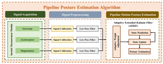 This study utilized the pipeline posture sensing module to collect the pipeline’s subsea posture signals. Sensing modules separately recorded dynamic information regarding acceleration, angular velocity, and magnetic field strength as for the pipeline posture estimation. However, due to intrinsic sensor properties and extrinsic environmental factors, the signals measured by the accelerometer, gyroscope, and magnetometer are susceptible to signal drift. Over time, drift accumulates, leading to cumulative errors in pipeline posture estimation after the integral computation. Therefore, this study adopted signal preprocessing methods to reduce cumulative errors and obtain posture data with higher accuracy. The signal preprocessing methods include the following: (1) Signal calibration technologies. To calibrate accelerometer and gyroscope signals, sensors were installed in a 20 °C incubator; a multi-directional rotation device was used to record output signals under various orientations, thereby determining scale factors and offsets for calibration. Magnetometer calibration involves three-axis rotation in an environment free of strong magnetic interference, using the least squares method for matrix calibration to obtain the calibrated magnetometer outputs; (2) Noise filtering technologies. Since sensors are affected by high-frequency noise such as ocean currents in the marine environment, low-pass filters are used to filter out these interferences and obtain clear motion posture signals. Once filtered, the calibrated acceleration signal , angular velocity signal , and magnetic field signal can be obtained. For estimating the pipeline’s posture angles, nine calibrated sensing signals were input into the EKF, fusing the acceleration, angular velocity, and magnetic field data to enhance pipeline posture estimation accuracy. Acceleration and magnetic values may be affected by the motion acceleration of the external pipeline movements and ambient magnetic field interference, leading to posture estimation errors. Therefore, the Adaptive Weighting Adjustment parameters within the EKF were adjusted to reduce the instant response time of the accelerometer and magnetometer under external interference, improving the stability of posture estimation. The algorithm is based on the following steps:
