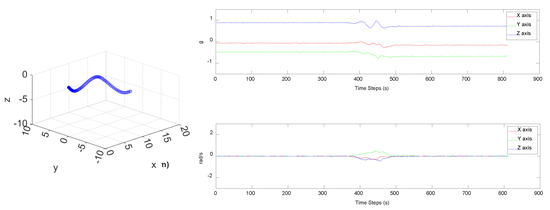 In this study, the pipeline posture sensing module provides signals from the accelerometer, gyroscope, and magnetometer. The resulting nine-axis signals were processed via the posture estimation algorithm to derive motion posture parameters. Then, acceleration vectors were transformed into acceleration relative to the Earth’s axis, allowing for the calculation of velocity and displacement to output a posture model. Figure 5 shows the real-time posture of the pipeline in a “W” configuration, as detected by the pipeline posture sensing module. It validates the EKF-based posture algorithm’s capability to accurately estimate the real-time shape of the pipeline posture.