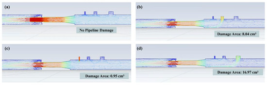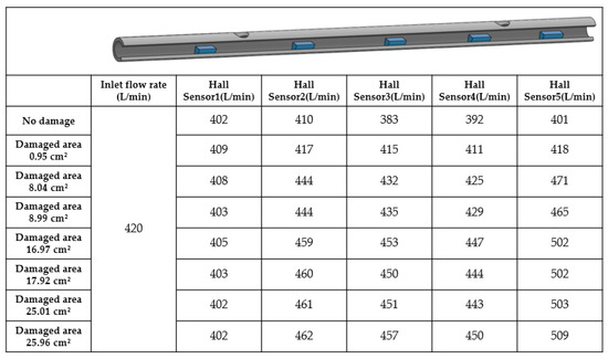 The simulation results depict fluid velocity using a color gradient from blue (slow) to red (fast). When the pipeline is intact, as in Figure 6a, the fluid flows uniformly inside the pipeline, with no evidence of leakage or other anomalies. Fluid velocity remains roughly constant throughout, with more pronounced changes occurring only near the inlet and outlet regions. Particularly in the pipeline’s narrow sections, a reduction in cross-sectional area leads to increased fluid velocity. The flow within the pipeline is stable and exhibits a predictable velocity distribution. Figure 6b–d shows that when the pipeline is damaged, external fluid enters the pipeline primarily due to the differential pressure (internal pressure is lower than external pressure). Therefore, the flow velocity manifests as a transition from blue (slow flow velocity) to red (high flow velocity). Furthermore, a marked difference in flow signals is detected by the Hall sensors installed before and after the pipeline’s damage locations. Figure 7 shows that the hole with an area of 5 cm2 resulted in a 20 L/min flow variation; the hole with an area of 10 cm2 resulted in a 37 L/min flow variation; the hole with an area of 15 cm2 resulted in a 50 L/min flow variation. The relationship between pipeline damage area and flow variation serves as a critical reference for the accurate estimation of the pipeline’s damage area and location.