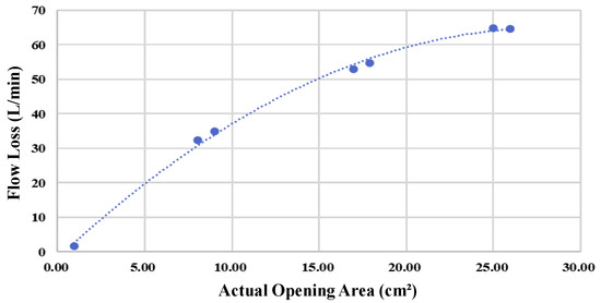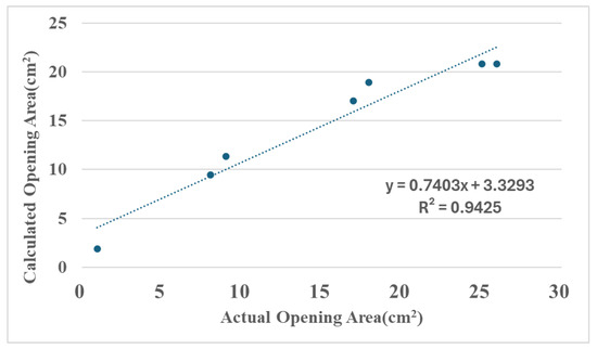 As shown in Table 2 and Figure 12, the flow difference is obtained from the disparity between downstream and upstream Hall sensors. The obtained difference is then used to estimate the damaged area through the relationship illustrated in Figure 7. The table shows that particularly at the minimum damage area (0.95 cm2), the percentage error in the calculated area reaches as high as 99%, suggesting that the algorithm has low accuracy. However, the errors are due to the limitations of the experimental tools because they primarily stem from the measurement error range of the Hall sensors. When the actual flow variation (7.5 L/min) is minimal and approaches the sensor’s error margin, any slight deviation may be magnified in percentage calculations. As the damage area progressively increases, the flow increment far exceeds the sensor error range. Under this condition, the accuracy of the calculated results may significantly improve. For instance, at a damage area of 16.97 cm2, the percentage error may even drop to 0%. Moreover, when the damage area reaches 25.95 cm2, the area calculation error is also maintained within 5.16 cm2, demonstrating the model’s stability during significant flow variations. This validates that the computation model proposed in this study can provide a valuable prediction under experimental constraints. Figure 13 shows the X-Y distribution of estimated versus actual damage areas, with a trend line R2 value of 0.9425. This positive correlation indicator clearly indicates the strong linear relationship between the two datasets, and further illustrates the critical physical inference that an increase in the damage area leads to a greater flow increment. These findings confirm the model’s effectiveness and practical value.