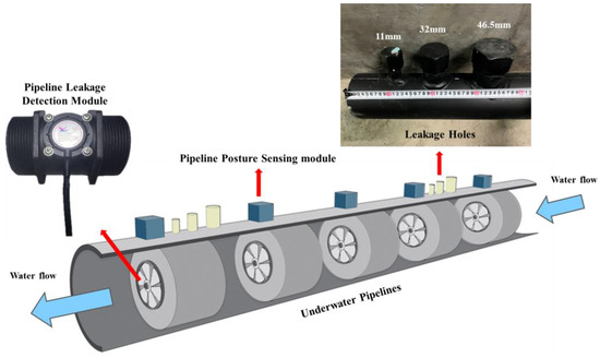 This study integrated the pipeline posture sensing and leakage detection modules to establish the subsea sensing module, facilitating the development of an underwater pipeline monitoring system. The subsea sensing modules were deployed in arrays along the external surface and the internal bore of the pipeline, enabling real-time underwater monitoring (Figure 1). The posture sensing modules were used to collect the motion posture of the pipeline. In contrast, the pipeline leakage detection modules were used to analyze the damaged area and identify leak locations based on the CFD theory.