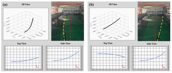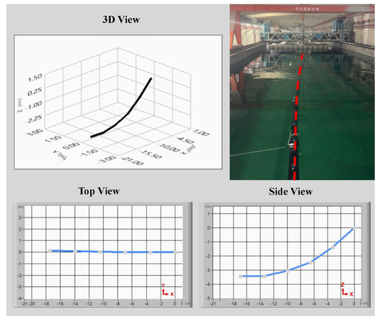 During the deep-seawater pipeline posture experiments, posture sensing devices were affixed at 3.5 m intervals along the intake pipeline. Array-type pipeline posture sensing modules were used to collect the seawater pipeline’s motion posture signals, which were transmitted to a human–machine interface system. The pipeline posture estimation algorithm was used to calculate the roll, pitch, and yaw during seawater pipeline movement. These posture signals were used to generate the top, side, and 3D views displayed in the human–machine interface, providing a clear and intuitive understanding of seawater pipeline bending or buckling. This validates the accuracy of the pipeline posture sensing modules and estimation algorithms. Figure 9 shows that during the pipeline posture experiments in the towing tank, the pipeline’s outlet end was positioned above the floating platform; the inlet end was bound with ballast blocks to allow it to naturally sink to the tank floor. Waves with a height of approximately 0.5 m were generated by the wave maker to observe changes in pipeline posture. The side view in Figure 9 shows that when the pipeline sank to the tank floor, the human–machine interface illustrates the pipeline resting at a water depth of 3.3 m. Comparatively, a lateral shift of approximately 1.3 m to the left side at the pipeline’s end was produced by the wave’s effect. Figure 10a shows that the pipeline was deflected 1.5 m to the left, producing a leftward bend. The top view of the human–machine interface shows that the pipeline had a lateral shift of approximately 1.5 m to the left. The side view shows that the inlet end of the pipeline was positioned at a water depth of 2.7 m; the outlet end was positioned above the floating platform. Figure 10b shows that the pipeline was deflected 1.5 m to the right, producing a rightward bend. The top view of the human–machine interface shows that the pipeline had a lateral shift of approximately 1.5 m to the right. The side view shows that the inlet end of the pipeline was positioned at a water depth of 2.8 m; the outlet end was positioned above the floating platform. Finally, the seawater pipeline posture observation experiments prove that when the pipeline posture changes because of waves, the pipeline posture sensing module can plot the dynamic signals into a 3D posture diagram of the seawater pipeline through the estimation algorithm, aligning with the actual pipeline postures of the experiment. Therefore, the study can accurately reflect the actual postures of the seawater pipeline. This system can help onshore engineers monitor the status of pipelines in real time, providing immediate feedback while handling abnormal situations promptly to carry out pipeline maintenance in advance and reduce losses.