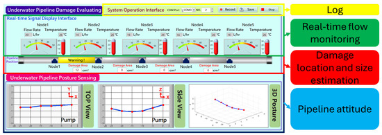 To achieve effective and timely monitoring of pipeline dynamics, this study developed a human–machine interface, as shown in Figure 14. In the pipeline posture section, the top view and side view of the pipeline can be observed on the human–machine interface. These views are drawn by calculating the pipeline posture signals through the pipeline posture sensing module. Through the 3D view, abnormalities such as bending or buckling of the underwater pipeline can be determined more intuitively. In the pipeline leakage real-time detection section, the instrument can display the flow rates measured by each Hall sensor at corresponding pipeline locations. Data variations between adjacent flow meters can be used for the real-time estimation of perforation areas and locations. Additionally, the logbook function in the upper right corner of the interface records the system’s real-time operational status and alert events, providing an important basis for subsequent data analysis and abnormality tracking.