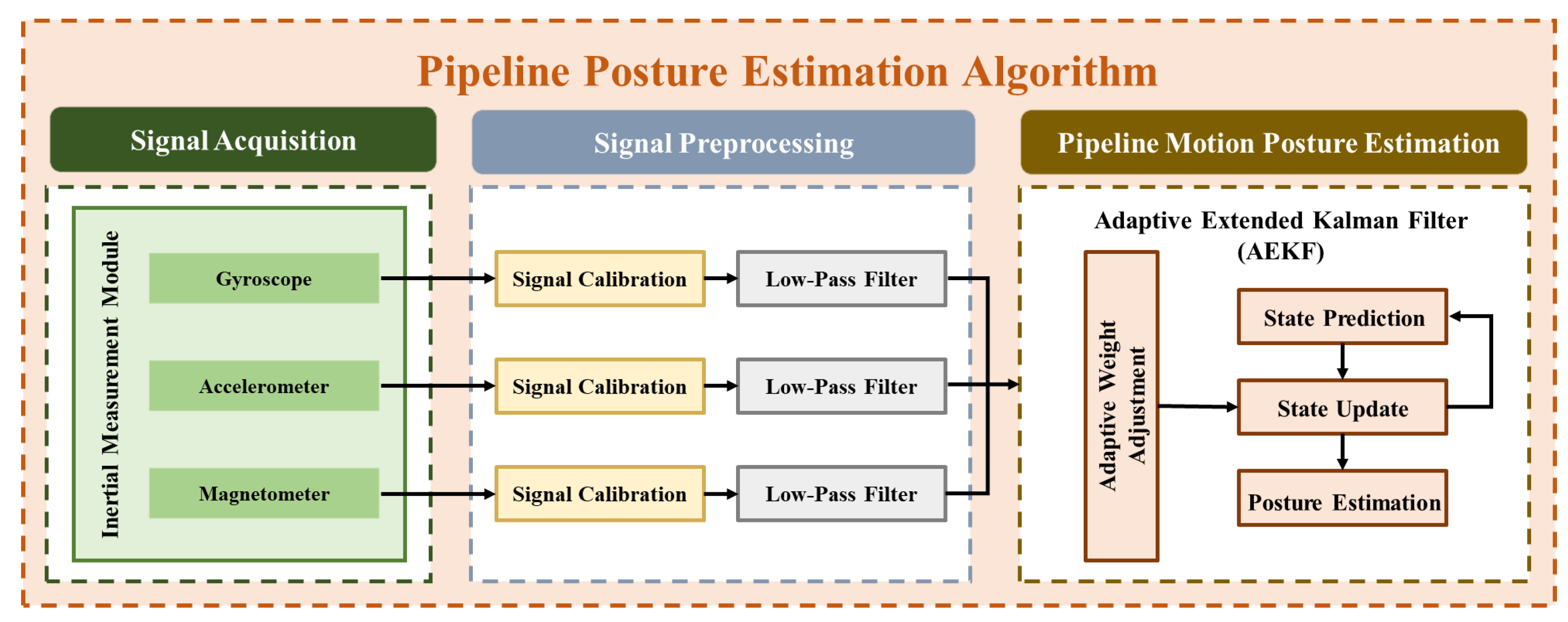 - Adaptive weight adjustment: Through the adaptive adjustment of the acceleration noise covariance matrix () and the magnetic noise covariance matrix () during state update, the weight of the Kalman gain () can be adjusted. This shortens the filter’s transient response time and enhances the stability of the pipeline posture estimation. First, errors in the acceleration and magnetic values due to motion acceleration or magnetic disturbances were divided into magnitude errors () and direction errors (), as shown in Equations (3) and (4). Next, magnitude and direction errors were synthesized using a natural exponential function to obtain the adaptive trust parameter . Next, Equation (5) shows that the parameter reflects the reliability of the acceleration or magnetic values under external disturbances: as approaches 0, the reliability of using acceleration and magnetic values to estimate postures decreases, indicating significant external influences on the inertial sensors, as approaches 1, the reliability of using the acceleration and magnetic values to estimate the postures increases, indicating minimal external influences on the inertial sensors. Finally, the adaptive trust parameter was used to adjust the acceleration or magnetic noise covariance matrices, achieving optimized Kalman gain. This serves to reduce the EKF’s instantaneous response time and improve the stability of the overall posture estimation process.