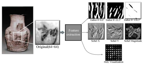 As shown in Figure 1, traditional feature extraction techniques, such as Gabor filters [], Sobel gradients [], and Histogram of Oriented Gradients (HoG) [,], offer interpretable low-level descriptors but fall short in capturing high-level semantic structures in damaged or stylized characters. On the other hand, deep learokning models such as CNNs and RNNs have demonstrated high performance in modern handwriting tasks but are often regarded as black-box systems with limited transparency [] and high dependency on large annotated corpora—an impractical requirement in the context of historical character collections [,].