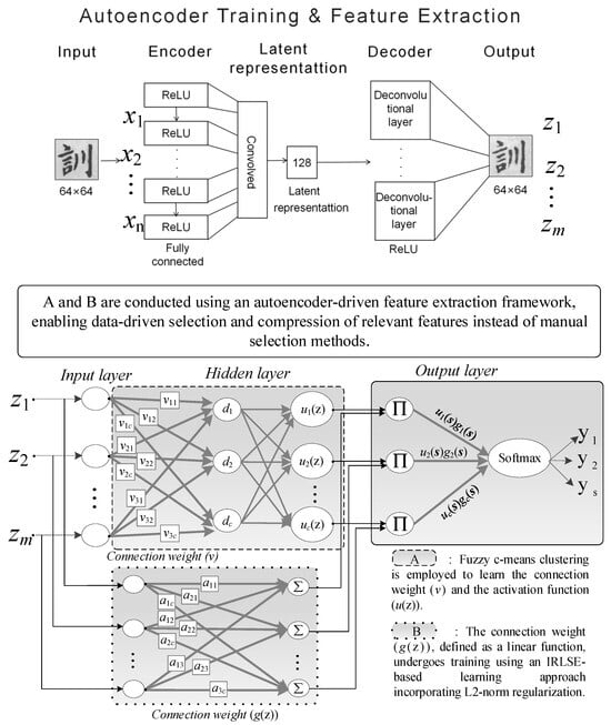 To overcome these limitations, we propose FAIR-Net (Fuzzy Autoencoder and Interpretable Rule-based Network), a two-stage hybrid model specifically designed for robust and explainable recognition of ancient Chinese characters. In the first stage, a deep autoencoder performs unsupervised feature extraction, compressing high-resolution character images into compact latent representations that suppress background noise and preserve semantic structure [,,,,,]. Unlike traditional dimensionality reduction methods such as PCA, which lack adaptive feature learning, the autoencoder is well-suited for large-scale, heterogeneous data due to its nonlinear mapping capacity and data-driven learning [,,].