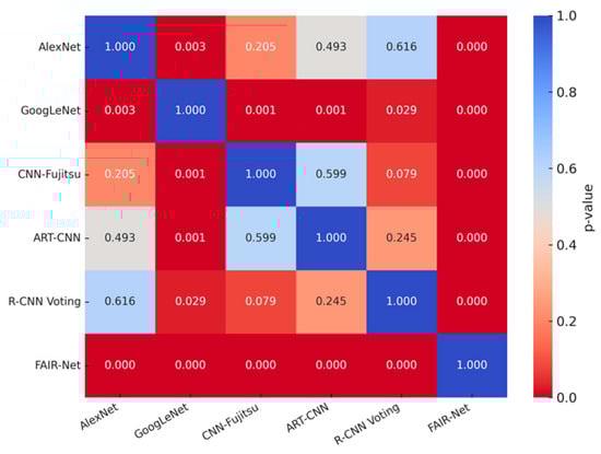 To further ensure that these differences are statistically sound, we conducted paired t-tests between FAIR-Net and all baseline models. The results (p < 0.001 across all comparisons) confirm that the observed accuracy gains are statistically significant. For better clarity, Figure 4 presents a heatmap visualization of the pairwise significance results, where warmer or redder colors correspond to smaller p-values. This visualization helps readers intuitively assess the robustness of the comparisons. It should also be noted that the reported results for baseline models were taken from prior literature, and slight differences in implementation settings (e.g., training epochs, learning rate schedules, or augmentation strategies) could influence the absolute performance. Therefore, the comparisons mainly serve as representative references rather than strict apples-to-apples benchmarks.