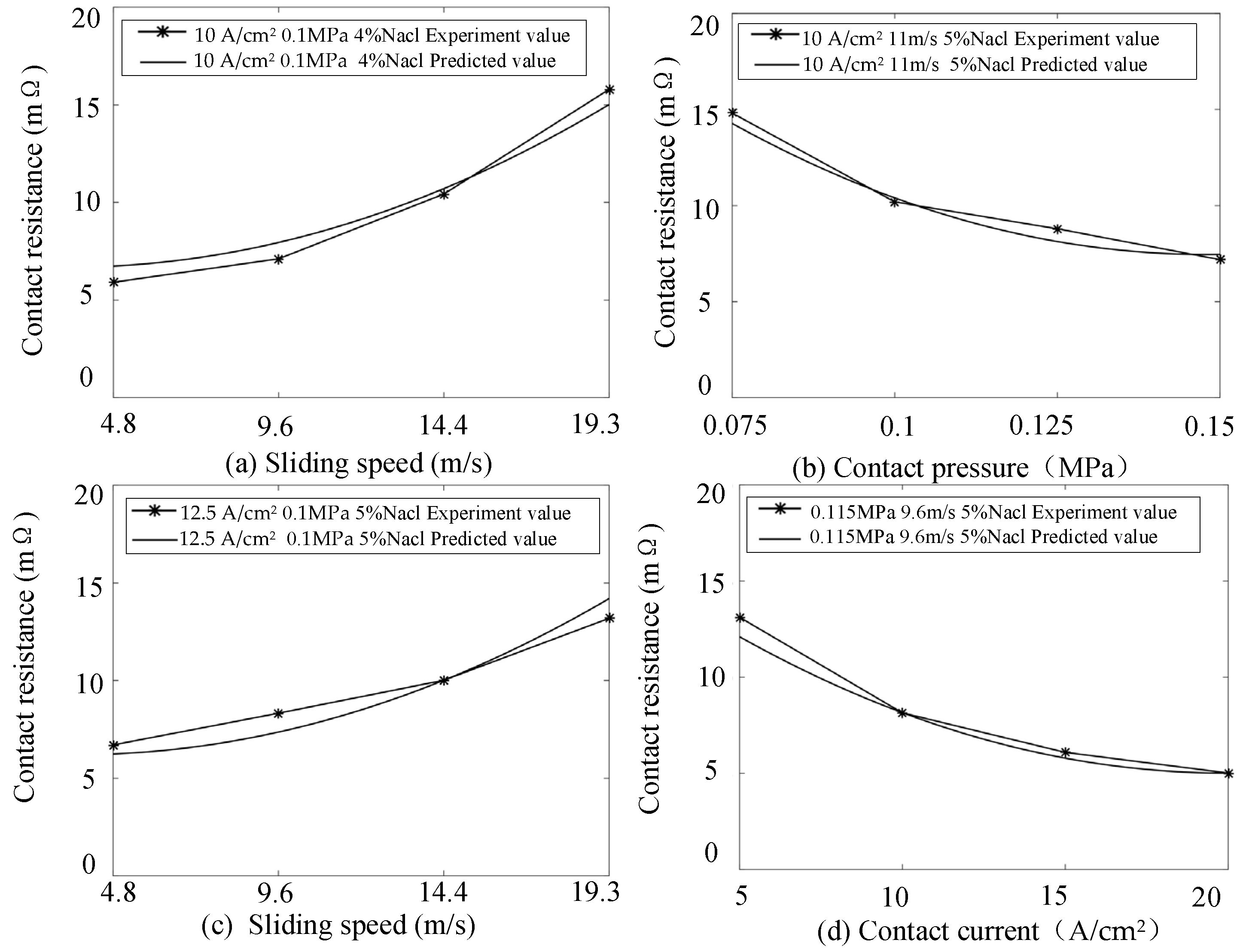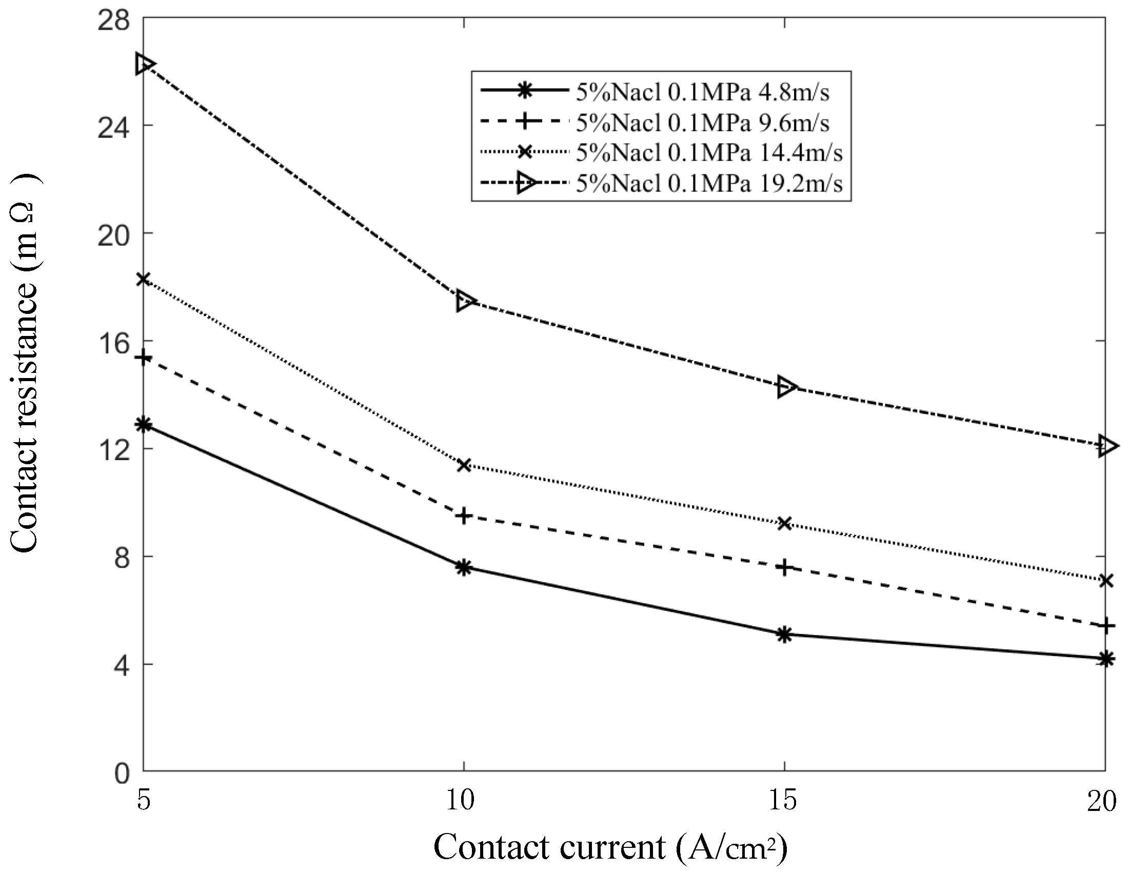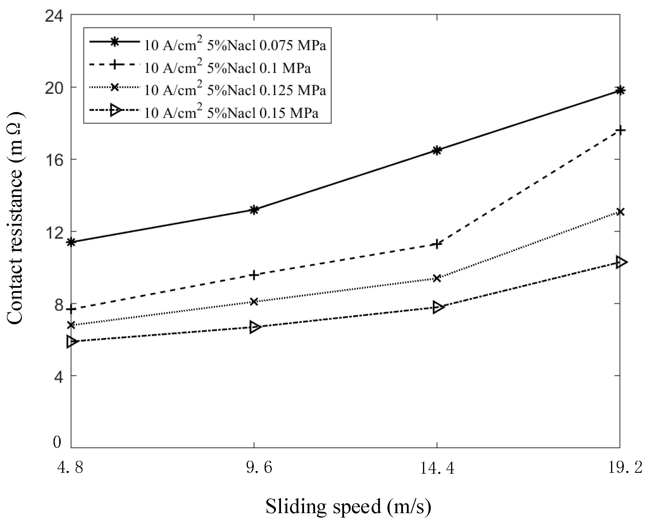 - Speed influences the dynamic behavior of conductive spots on the contact surface. As speed increases, abrasive wear intensifies, leading to the accumulation of dust and oxide films that degrade the conductivity of the contact spots [25], thereby increasing contact resistance.