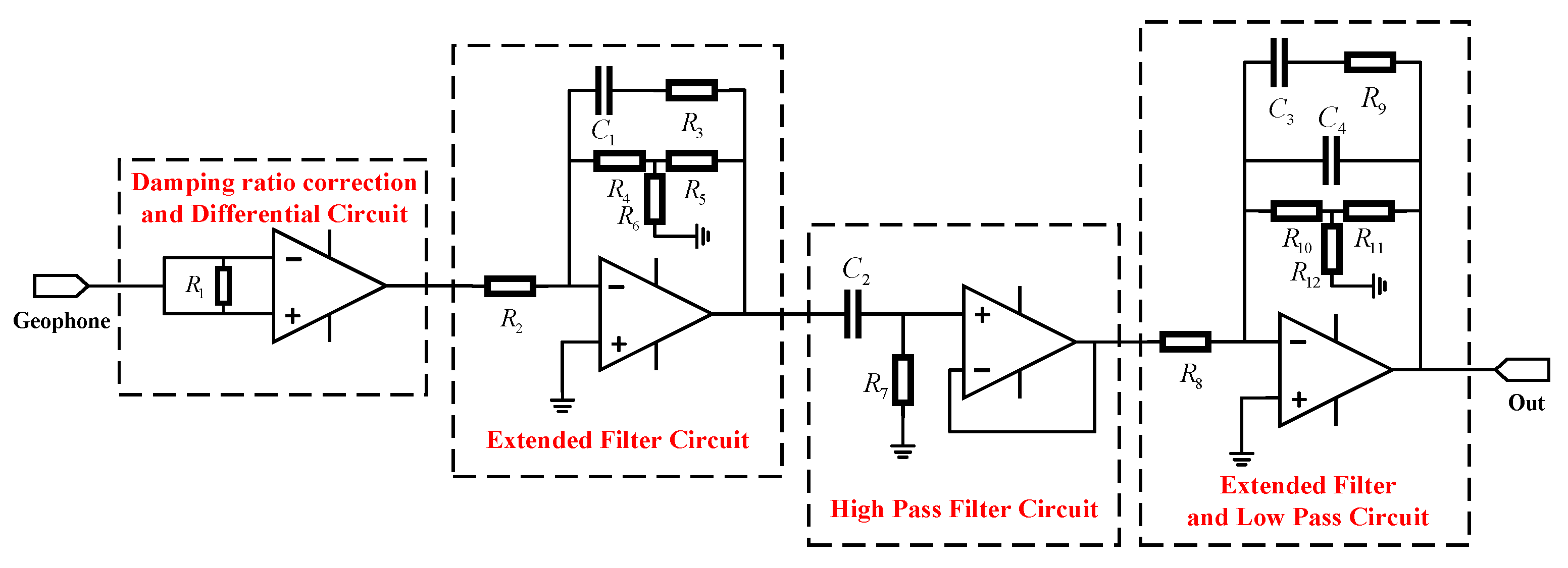 - Choi, J.; Yoo, H.; Choi, E.; Kim, K.; Kim, H.-J. An Active Geophone Sensor with Optimized State Variable Filter for Measuring Low-Band Frequencies. Int. J. Precis. Eng. Manuf. 2024, 25, 981–993. [Google Scholar] [CrossRef]