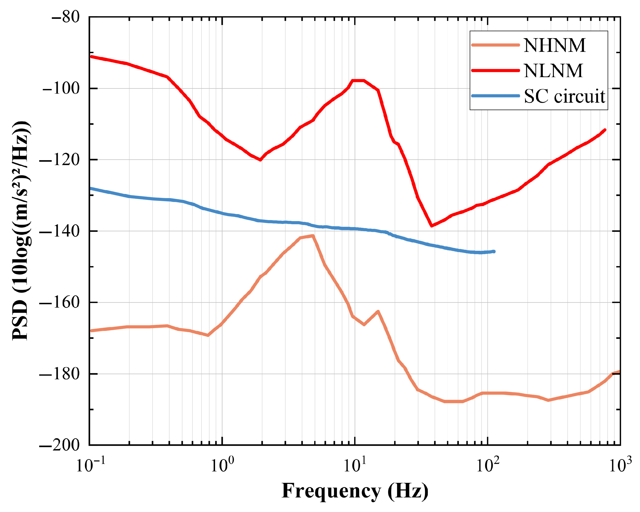 - Riedesel, M.A.; Orcutt, J.A.; Moore, R.D. Limits of sensitivity of inertial seismometers with velocity transducers and electronic amplifiers. Bull. Seismol. Soc. Am. 1990, 80, 1725–1752. [Google Scholar] [CrossRef]