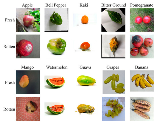 - Sultana, N.; Jahan, M.; Uddin, M.S. An Extensive Dataset for Successful Recognition of Fresh and Rotten Fruits. Data Brief 2022, 44, 108552. [Google Scholar] [CrossRef]