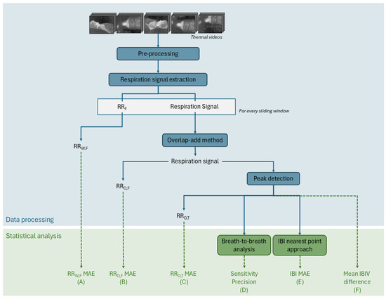 To evaluate the performance of the thermal imaging system, several metrics were computed using the abdominal signal from the PSG system as reference. The green steps in
