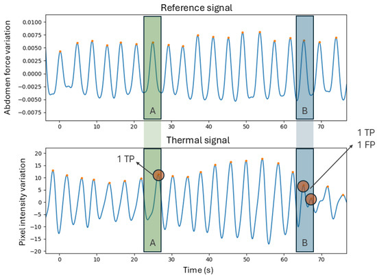 15]. This method allows for the quantification of the breaths that were correctly identified or missed. This is done by establishing a window that is centered on each peak in the reference signal and limited to half the distance to the neighboring peaks. For each window, if the number of peaks is equal to one, it means that the breath was correctly identified and therefore there is a true positive (