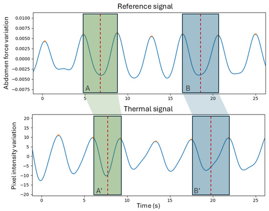 18] was used—a nearest neighbor (NN) approach. This is performed by computing the central points of all IBIs and matching these points in the reference signal to the closest ones (in time) in the thermal signal. This means that every IBI of the reference will be matched, but the opposite is not verified. Missed breaths or extra breaths detected will result in longer or shorter IBIs in the thermal signals that will affect the comparison.