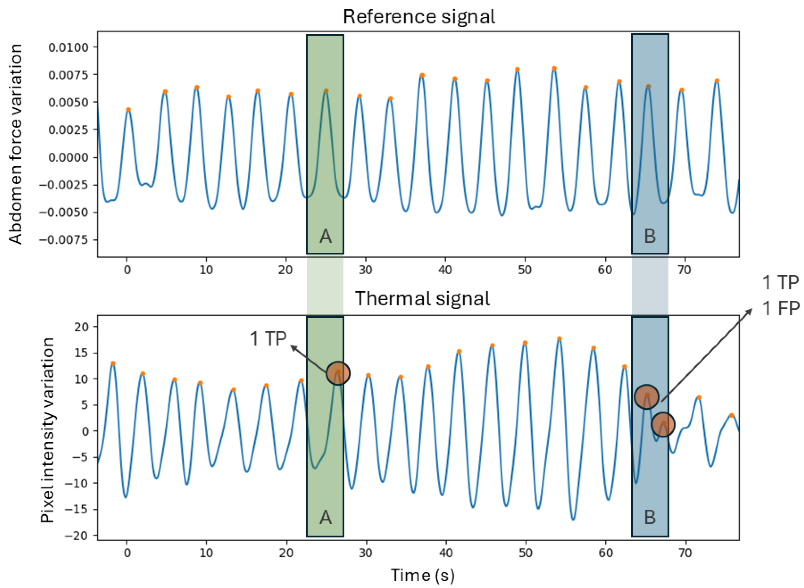 Figure 2 show the various metrics used to evaluate the quality of our thermal camera-based techniques compared to the reference signals. In this section, we will detail how each of these 6 metrics, labeled from (A) to (F), is computed.