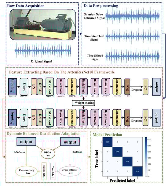 Traditional approaches to diagnosing faults in rolling bearings are typically categorized into three distinct groups. The first category is based on signal decomposition combined with envelope spectrum analysis. For instance, Li et al. [6] proposed a method that optimizes the influence parameters of Variational Mode Decomposition (VMD) based on the kurtosis of the envelope signal, which effectively reduces the workload. However, these methods rely heavily on expert experience for rule-based reasoning, making them inherently qualitative. When fault features are not identifiable, the diagnostic results are highly susceptible to subjectivity. The second category encompasses machine learning-based diagnostic methods. For instance, Wang et al. [7] combine Recurrence Quantification Analysis with a Support Vector Machine enhanced through Bayesian optimization (RQA–Bayes–SVM) for fault diagnosis. These methods allow for quantitative analysis but assume that the equipment operates under constant conditions. However, in practical industrial environments, equipment types, loads, and speeds often vary due to environmental changes, which limits the generalizability of the model. The third method leverages deep learning models to automatically derive features from vibration data, thus removing the reliance on manual feature extraction [8]. For instance, Dai et al. [9] apply one-dimensional Convolutional Neural Networks (CNNs) to evaluate the fused characteristics of vibration and acoustic signals for diagnosing bearing faults. Gao et al. [10] enhanced the diagnostic capability of a Deep Belief Network (DBN) by optimizing its performance through the application of the Salp Swarm Algorithm (SSA). Cui et al. [11] introduced a Feature Distance Stacked Autoencoder (FD-SAE) to accelerate training, following initial data categorization using a basic linear Support Vector Machine (SVM). However, these approaches typically presume that training and testing datasets exhibit identical distributions and demand extensive data volumes for training to guarantee precise outcomes.