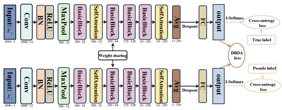 where and are the adaptive weights for the marginal and conditional distributions, respectively. The computation methods for the CDA loss and MDA loss are shown in Equations (11) and (12), respectively.