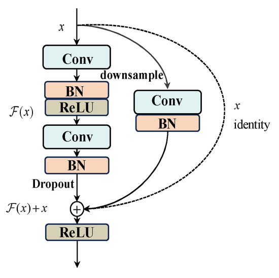 Figure 3 shows the BasicBlock structure in AttenResNet18. The dotted shortcut branch is utilized when the input and output dimensions are identical, directly performing an identity mapping. The solid shortcut branch is employed when the input and output dimensions differ, achieving dimension matching through a convolutional layer.
